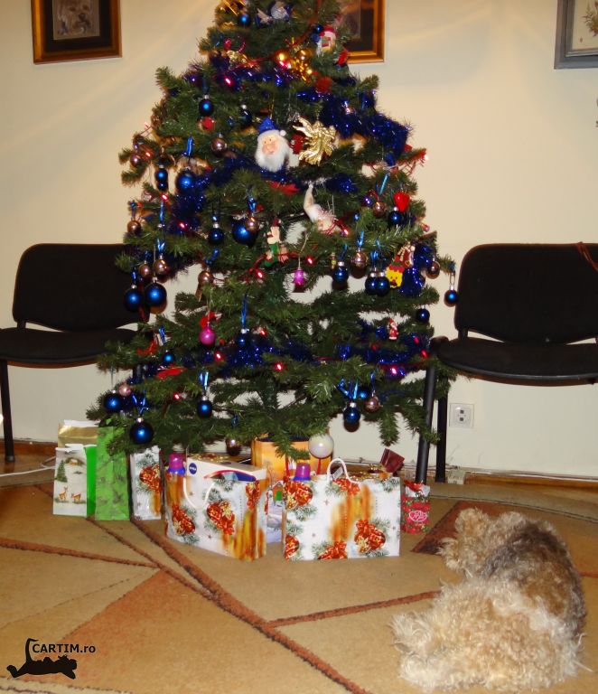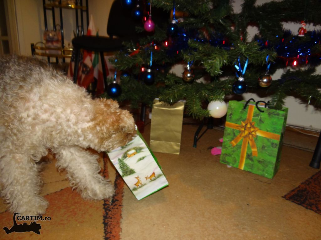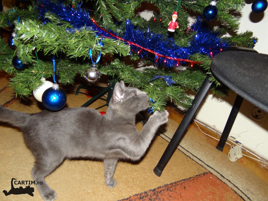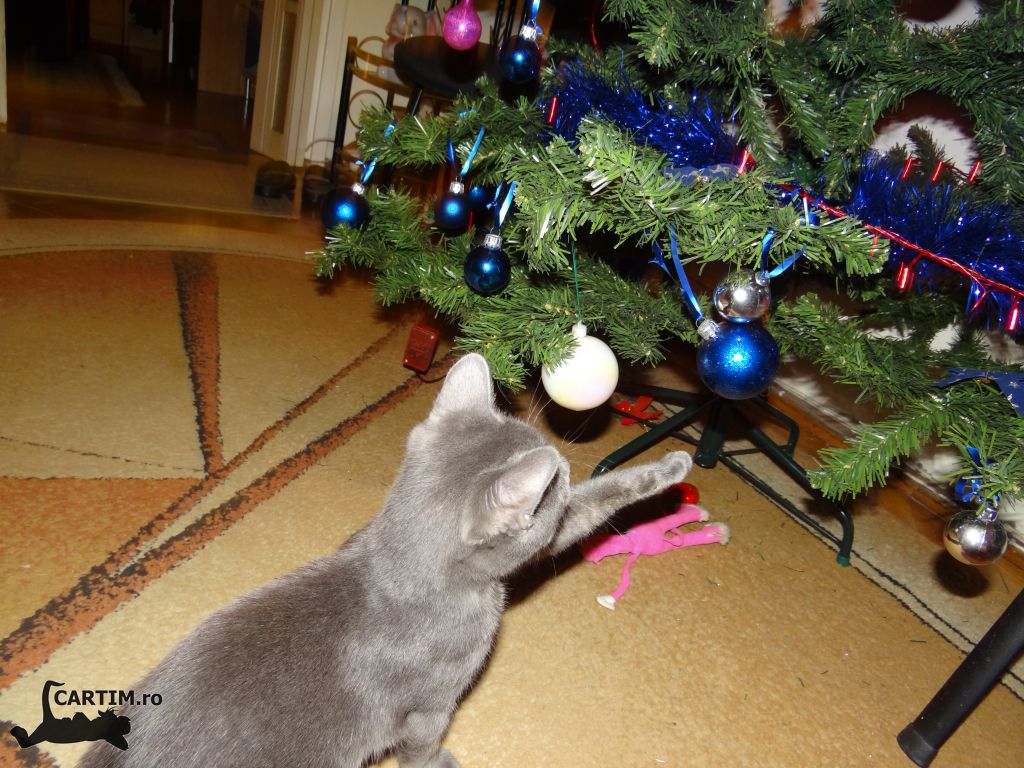 Adevarul e ca Junior a avut si ce pazi. Bradul e foarte frumos impodobit, cu mult albastru care mie, personal, imi place foarte mult. Blanita lui Yorky straluceste, cred ca de fericire ca a venit Mos Craciun. Imi place bucuria lor cand cauta prin pungutele cu daruri. Imi plac reactiile curioase ale motanului. S-a urcat in brad? Am inteles camai fac si asta pisoii si cam strica bradutii impodobiti. Din pacate. 🙂
